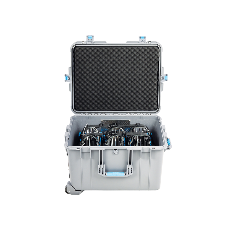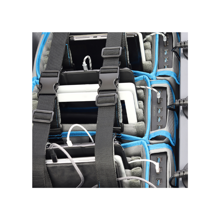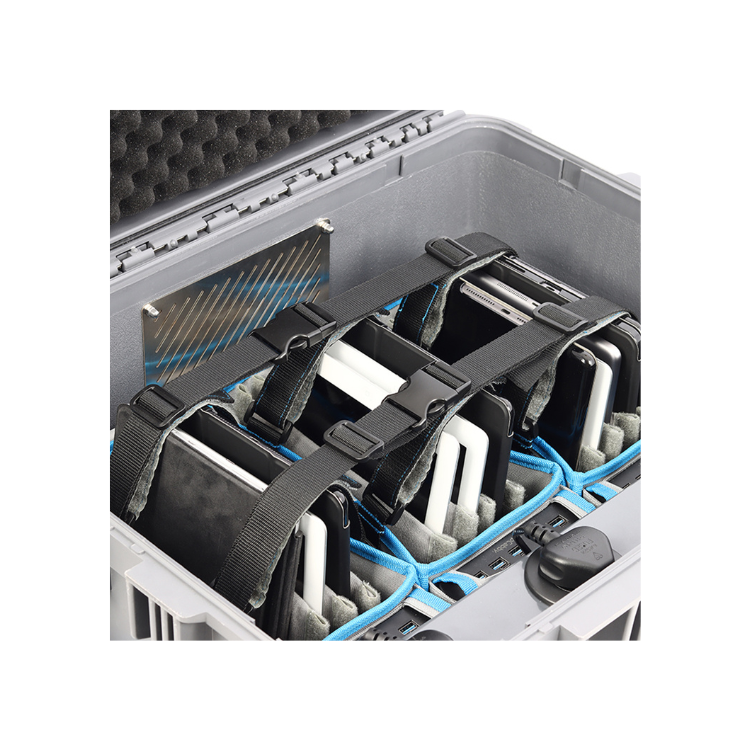 Valise mobile permettant de recharger jusqu’à 15 tablettes (jusqu’à 13″) via USB-A et USB-C. Idéale pour les environnements scolaires, professionnels et mobiles.